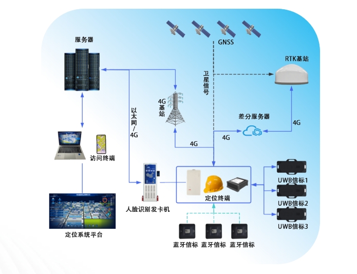 UWB技術:UWB技術以其高精度、抗干擾能力強的特點,在室內或衛星信號遮擋嚴重的區域表現出色。通過安裝UWB信標,與人員佩戴的定位終端進行雙向測距,計算出位置后上傳服務器,實現室內精準實時定位。